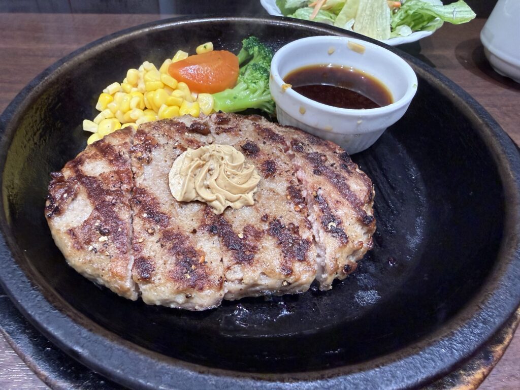 ランチでも高くなったなーという感じ。いつも(ゆうて年数回程度)いきなりステーキではステーキではなくハンバーグが好きなので、今回もハンバーグランチを選択。優待で値引きがあるのでちょっと贅沢にデフォルト?の150gから200gへ変更。