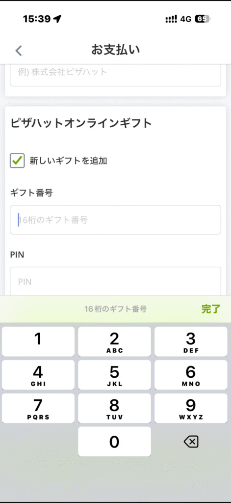 二枚目無料とか、二枚目半額と合わせて使えるのか不安でしたが、ピザハットアプリで普通に持ち帰り注文を入力していき、お支払い画面になったらギフト番号のところに、ヤマエグループから発行された株主優待の3,000円分ギフトコードを入力するだけ。